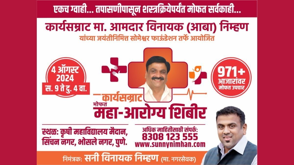 Deputy Chief Minister, Honorable Mr. Devendraji Fadnavis, will inaugurate the Karayasamrat Free Mega Health Camp on Sunday, 4th August 2024, at 9 AM at Agricultural College Ground, Irrigation Nagar, Bhosalenagar, Pune. The program will be presided over by Deputy Chief Minister Hon. Mr. Ajit dada Pawar. The chief guests at the event include Minister of Civil Aviation and Cooperation Hon. Mr. Muralidhar Mohol, Deputy Speaker of the Legislative Council of Maharashtra State Ms. Neelam Gorhe, Minister of Higher and Technical Education Hon. Mr. Chandrakant Patil, Leader of the Opposition Hon. Mr. Vijay Wadettiwar, Minister of Rural Development Hon. Mr. Girish Mahajan, Minister of Medical Education Hon. Dr. Tanaji Sawant, Minister of Agriculture Hon. Mr. Dhananjay Munde, Minister of Industry Hon. Mr. Uday Samant, Deputy Leader of Shiv Sena Sachin Ahir, MP Supriya Sule, MP Amol Kolhe, and all MLAs and former corporators from Pune city.